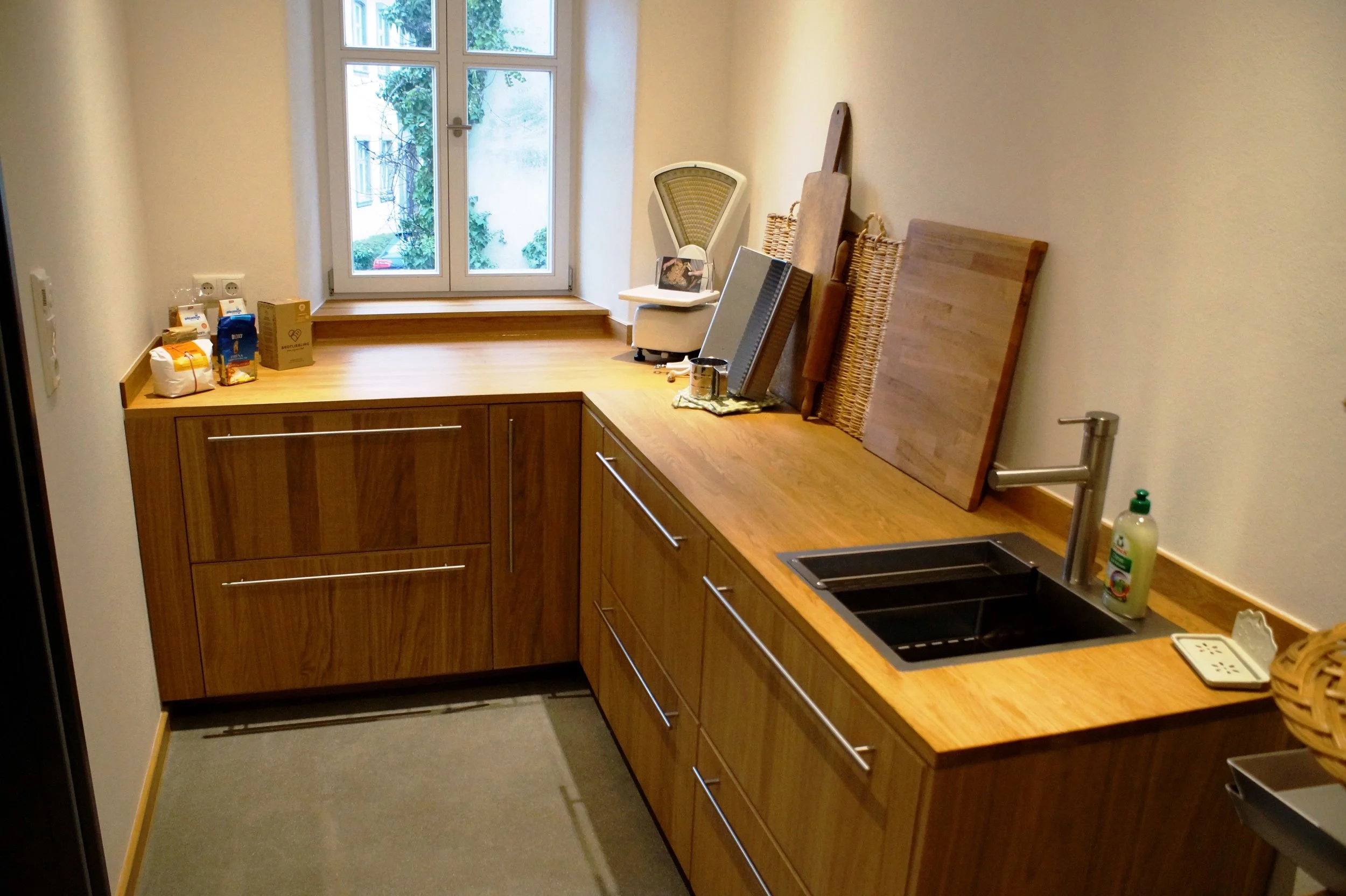 In der Backstube erlaubt es die tiefe Arbeitsfläche aus Eichenholz, köstlichen Blechkuchen auf historischen Backblechen mit 60 cm Durchmesser zu zaubern! Wie die Arbeitsplatte ist auch die Küchenfront aus Eiche, jedoch in einer rauen Hobeloberfläche gehalten um die Anmutung des Fachwerks im Flur aufzunehmen.